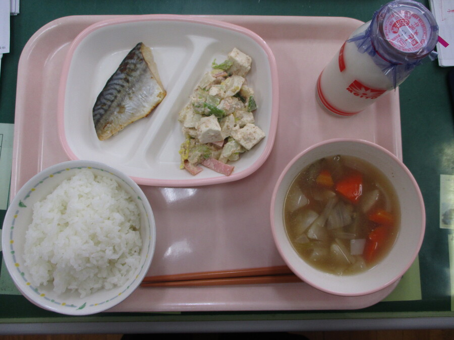 ご飯、のっぺい汁、鯖の塩焼き、豆腐のサラダ、牛乳