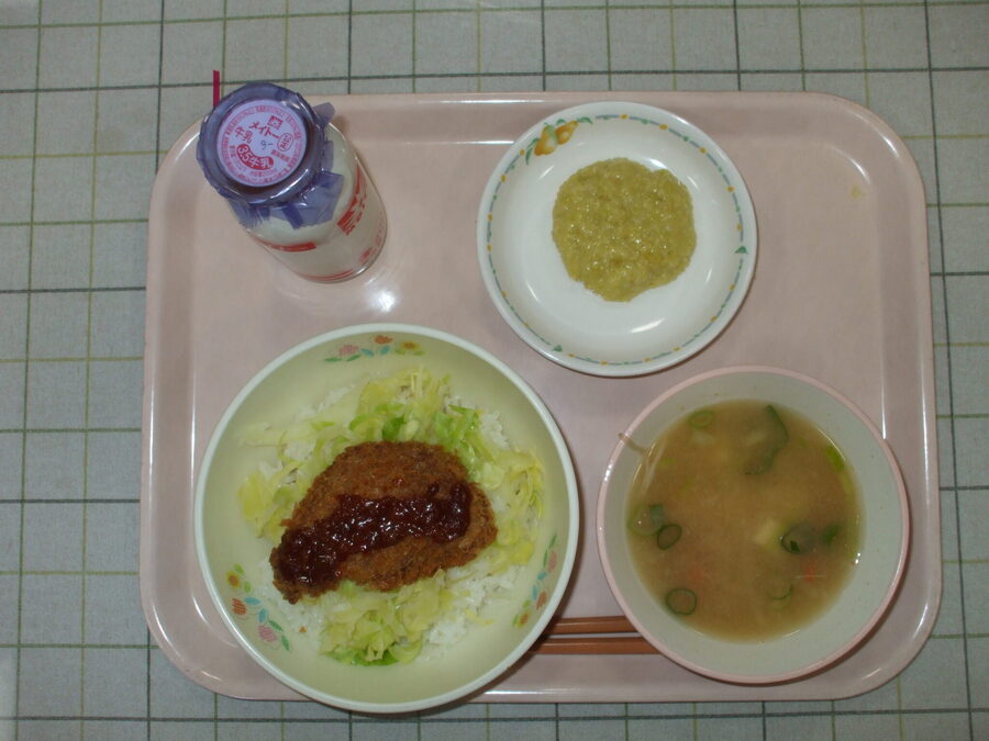 デミカツ丼 大根と豆腐のみそ汁 きびだんご 牛乳