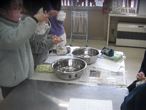 布をしぼって、輪ゴムで止めている場面を見せてもらいました。