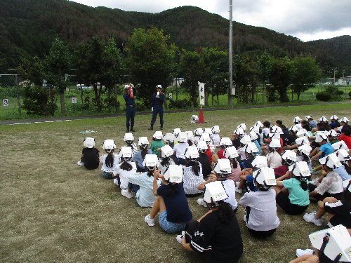 麻績消防署員4名に来校いただき避難訓練を実施しました。 今回は大地震が発生したという想定で校庭に避難しました。「お・は・し・も」をよく守って避難することができました。 その後、職員による消火訓練を行いました。